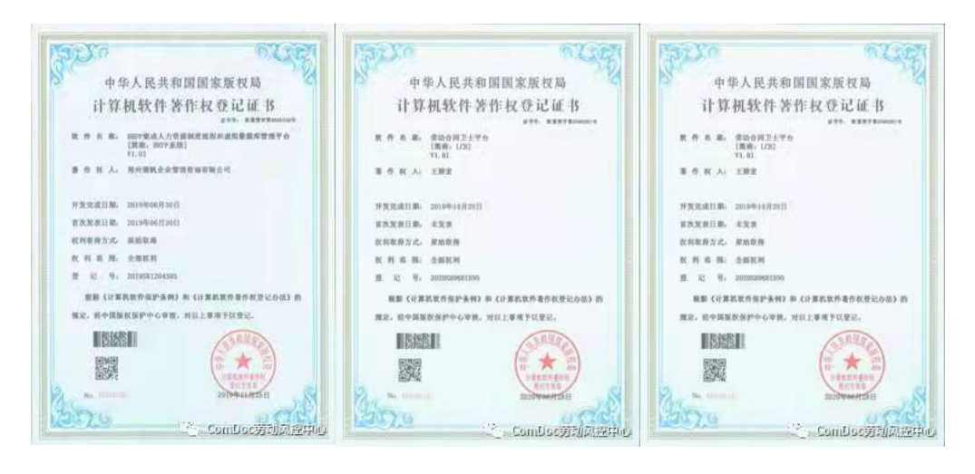 2017年,根据《计算机软件保护条例》和《计算机软件著作权登记办法》的规定,经中国版权保护中心审核,中华人民共和国国家版权局对我司ComDoc人力资源合规化智能管理系统软件著作权认定为原始取得并予以登记。