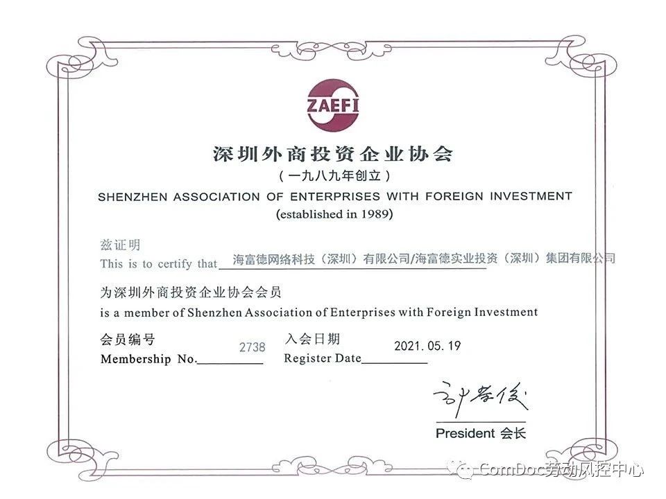 2021年5月19日,海富德实业投资(深圳)集团有限公司、海富德网络科技(深圳)有限公司经审成为深圳外商投资企业协会理事单位,携手深圳外商投资协会与深圳九万多家外资企业一起,为推动深圳经济发展做出贡献。
